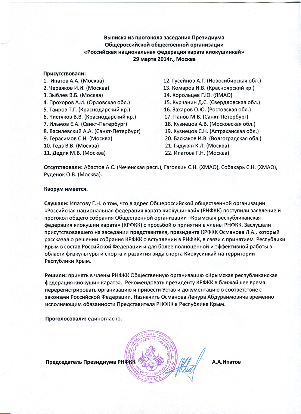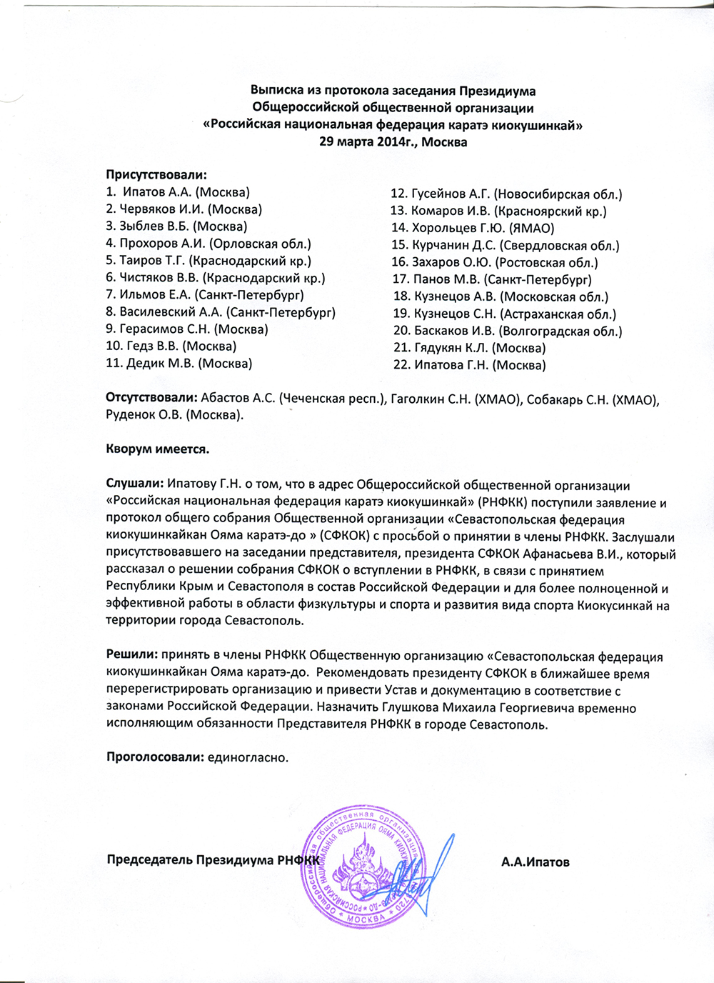29 марта 2014 года на Президиуме Российской Национальной Федерации каратэ киокушинкай были рассмотрены заявления о вступлении в РНФКК от "Крымской республиканской федерации киокушин каратэ" (КРФКК) и "Севастопольской федерации киокушинкайкан Ояма каратэ-до" (СФКОК).